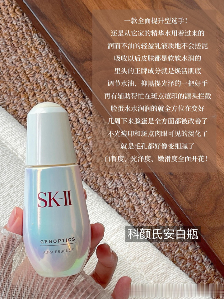 一款适合易晒黑肤质的精华,能够改善肤色不均,有PITERATM+光蕴复合精粹,能够均匀提亮肤色和改善暗沉,从神仙水到小灯泡,SK-II把PITERAT开发得很好,不仅渗透性和滋润度很强,改善肤色不均的能力也突出。