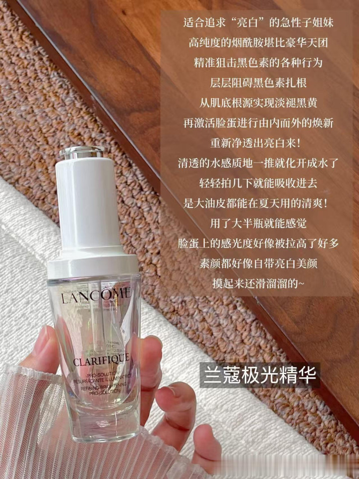 独特的液态丝缎质地很快渗透吸收,深入到肌底直击黑色素源头,从根本上减少黑色素的产生,坚持用下来最直观的就是原本暗沉的肤色明显提亮了,整个人看起来气色好了很多,不过要注意做好防晒工作。